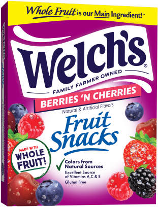 Welch’s® Fruit Snacks are made with Whole Fruit and no artificial dyes, are an excellent source of Vitamins A, C & E, gluten free, and more! The Berries ‘N Cherries variety features the perfect combination of flavors: Blackberry, Blueberry, Cherry, Dark Cherry, Strawberry and Raspberry.