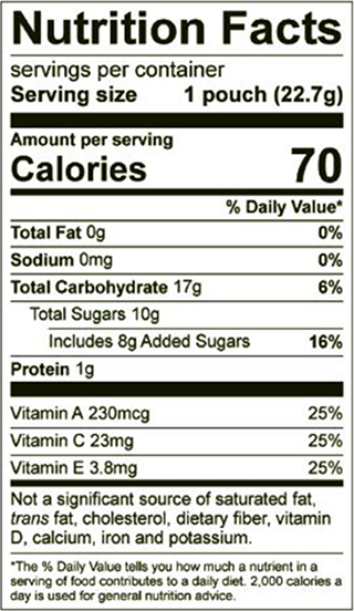 Whole fruit puree (grape, peach, strawberry, raspberry, blackberry, blueberry and cherry), corn syrup, sugar, modified corn starch, gelatin, citric acid (acidulant), lactic acid, natural and artificial flavors, ascorbic acid (vitamin C), alpha tocopherol acetate (vitamin E), vitamin A palmitate, carnauba wax, annatto (color), turmeric (color), and fruit and vegetable juice (color).