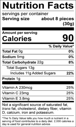 Whole fruit puree (grape, pineapple, mango, dragon fruit, kiwi, strawberry, passionfruit), corn syrup, sugar, modified corn starch, gelatin, citric acid (acidulant), ascorbic acid (vitamin C), alpha tocopherol acetate (vitamin E), vitamin A palmitate, sodium citrate, natural flavors, carnauba wax, annatto (color), turmeric (color), spirulina (color), and fruit and vegetable juice (color).