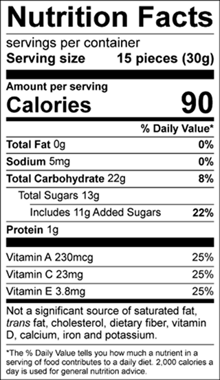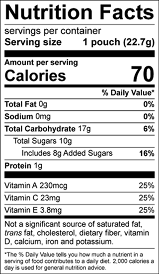 Whole fruit puree (grape and strawberry), corn syrup, sugar, modified corn starch, gelatin, citric acid (acidulant), lactic acid, natural and artificial flavors, ascorbic acid (vitamin C), alpha tocopherol acetate (vitamin E), vitamin A palmitate, carnauba wax, annatto (color), turmeric (color), and fruit and vegetable juice (color).