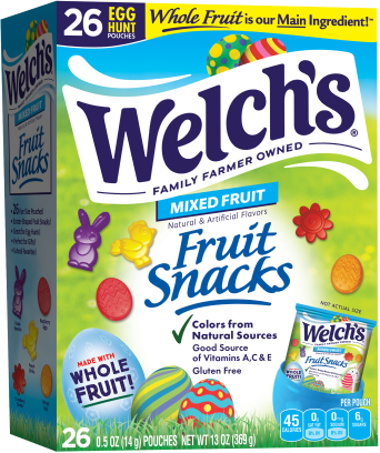 Welch’s® Fruit Snacks Easter mixed fruit edition features fun Easter shapes. Made with Whole Fruit as the Main Ingredient and no artificial dyes, these gluten-free snacks are a good source of Vitamins A, C & E. Perfect for all Easter occasions from Egg Hunts to Easter Basket fillers.