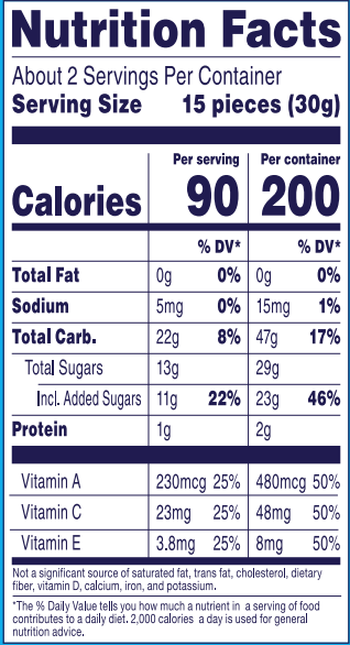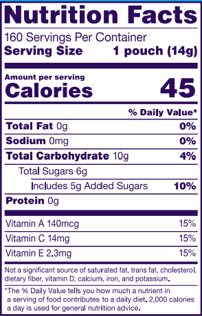 Whole fruit puree (grape, peach, orange, strawberry and raspberry), corn syrup, sugar, modified corn starch, gelatin, grape juice concentrate, citric acid (acidulant), lactic acid, natural and artificial flavors, ascorbic acid (vitamin C), alpha tocopherol acetate (vitamin E), vitamin A palmitate, carnauba wax, annatto (color), turmeric (color), and fruit and vegetable juice (color).